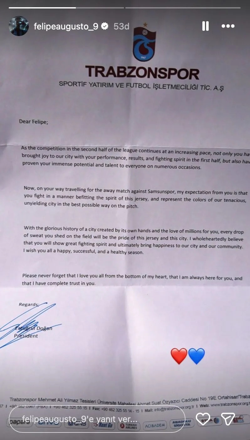Trabzonspor Başkanı Ertuğrul Doğan, Samsunspor deplasmanı öncesi futbolculara motivasyon mektubu gönderdi.