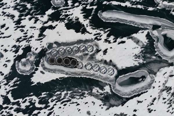 Kafes balıkçılığının yapıldığı baraj gölündeki balık kafesleri, buz kütlesinin altında kaldı.