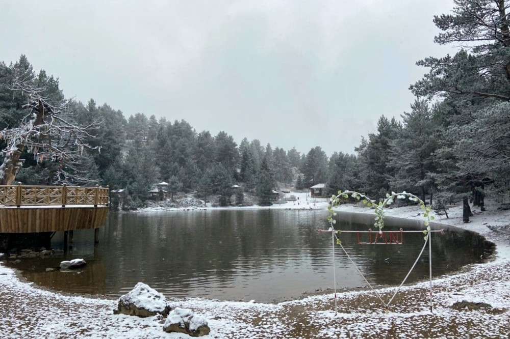 Denizden 2 bin 24 metre yükseklikteki Limni Gölü Tabiat Parkında sabaha karşı gerçekleşen hafif kar yağışının ardından göl ve etrafındaki ağaçlar beyaz örtüyle bezenirken ortaya seyrine doyumsuz manzaralar çıktı.