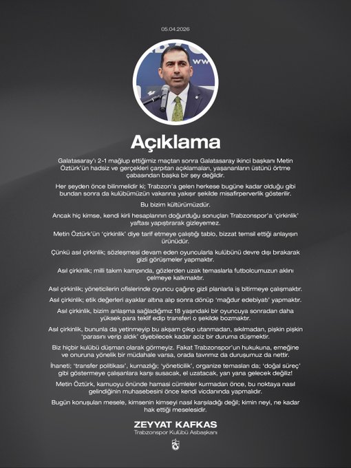 "Biz hiçbir kulübü düşman olarak görmeyiz. Fakat Trabzonspor’un hukukuna, emeğine ve onuruna yönelik bir müdahale varsa, orada tavrımız da duruşumuz da nettir. İhaneti ‘transfer politikası’, kurnazlığı ‘yöneticilik’, organize temasları da ‘doğal süreç’ gibi göstermeye çalışanlara karşı susacak, el uzatacak, yan yana gelecek değiliz! Metin Öztürk, kamuoyu önünde hamasi cümleler kurmadan önce, bu noktaya nasıl gelindiğinin muhasebesini önce kendi vicdanında yapmalıdır. Bugün konuşulan mesele, kimsenin kimseyi nasıl karşıladığı değil; kimin neyi, ne kadar hak ettiği meselesidir."