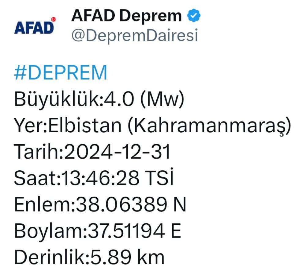 Afet ve Acil Durum (AFAD) Yönetimi Başkanlığı verilerine göre; merkez üssü Elbistan olan deprem, saat 13.46’da yerin 5.89 kilometre derinliğinde oldu. Depremde herhangi bir olumsuzluk yaşanmadı. Elbistan Kaymakamı Muhammet Fatih Demirel, “Şu an için bize, ilgili birimlerimize herhangi bir olumsuz ihbar gelmemiştir” dedi. (DHA)