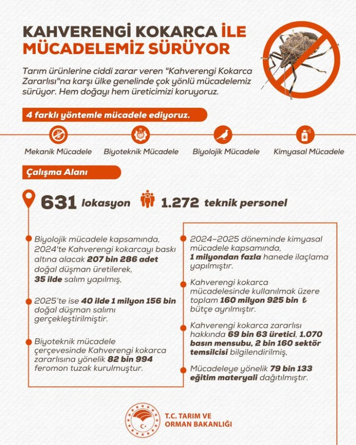 Kahverengi kokarca ile mücadele için 160 milyon 925 bin TL bütçe ayrıldı. Ayrıca 69 bin 63 üretici, 1.070 basın mensubu ve 2 bin 160 sektör temsilcisi bilgilendirilirken, 79 bin 133 eğitim materyali sahada dağıtıldı.