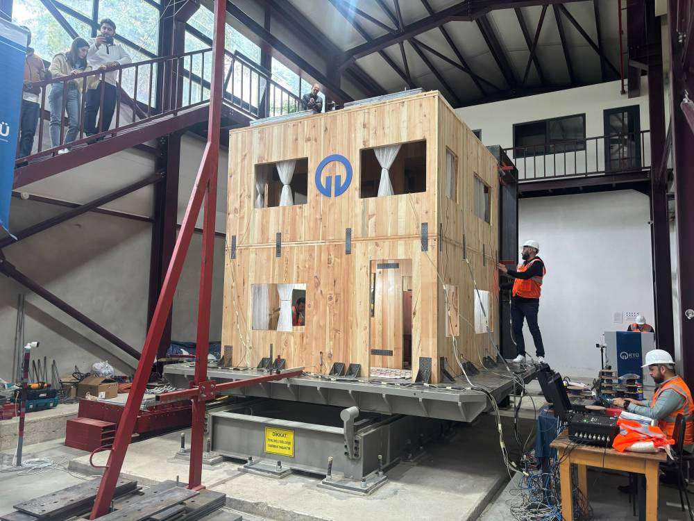 Ahşap yapıların gelecekte yeni yapı teknolojileri içerisinde yer alacağını ifade eden Altunışık, “Şu an arkamızda görmüş olduğunuz CLT’den oluşmuş ahşap binamızın üzerinde 30 tane sensör var. Bu sensörlerin bazıları yer değiştirme, bazıları şekil değiştirme ve bunlarla birlikte biz binanın farklı farklı depremler altında gösterebileceği davranışlarını ve her bir davranış sonucunda, her bir test sonucunda da yapının sağlığında ne kadarlık bir azalma meydana geliyor ve hangi noktada bina güçlendirmeye ihtiyaç duyacak veya hangi noktadan sonra da artık binayı kullanamayacak hale geleceğimizi konuşacağız. Arkamızdaki sarsma masası, ülkemizdeki en kapasiteli makinelerden bir tanesi. Şu an gerçekleştirmiş olduğumuz deneylerde 1990 yılından günümüze kadar meydana gelmiş Erzincan depremi, Kocaeli depremi, Van depremi, İzmir depremi, Elazığ-Malatya depremi gibi depremlerin deprem ivme kayıtlarını uyguladık. Buna ilave olarak da Kahramanmaraş depremlerinde meydana gelmiş ve neredeyse 1 G'ye yaklaşan ivmeleri de yine en son noktada uygulayabildik ve gördük ki binamızın, ahşap yapımızın taşıyıcı sistemi elemanlarında herhangi bir hasar oluşmuyor ve hasarlar daha çok bağlantı noktalarında ve yapının temel mesleğinden bölgelerinde, bağlantılarında oluşuyor. Bu bizim için aslında dünya literatürüne de uygun olan ve bizim de projemizde hedeflediğimiz bir nokta. Bu anlamda çok mutluyuz. Umuyorum ahşap yapılar ülkemizin bundan sonraki geleceğinde yeni yapı teknolojileri olarak yerini alır” diye konuştu.