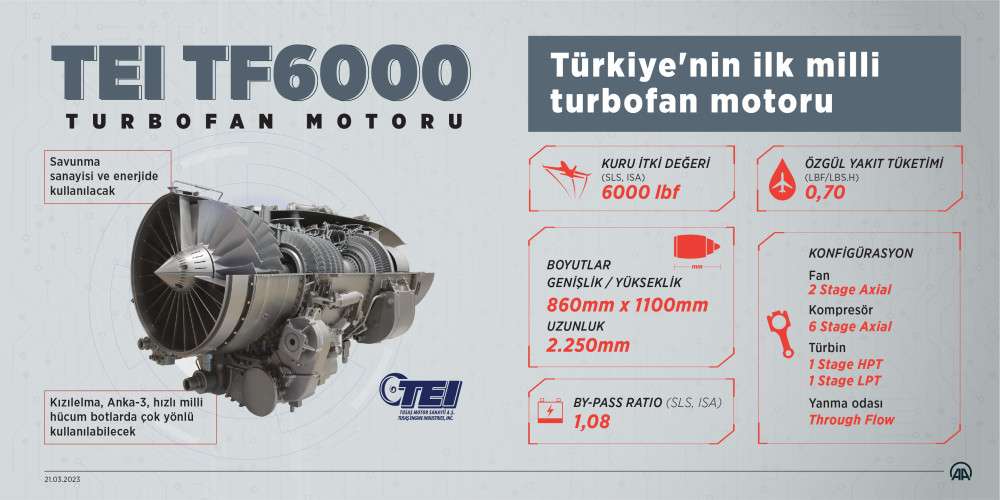 Türkiye'de geliştirilen en güçlü motor olan, savunma sanayisi ve enerjide kullanılması amaçlanan TEI TF6000 turbofan motorunun imalatının 2023'ün ilk aylarında tamamlanması ve yılın ilk çeyreğinde çalıştırılması hedefleniyor.