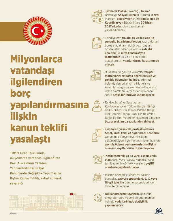 TBMM Genel Kurulunda, milyonlarca vatandaşı ilgilendiren Bazı Alacakların Yeniden Yapılandırılması ile Bazı Kanunlarda Değişiklik Yapılmasına İlişkin Kanun Teklifi, kabul edilerek yasalaştı.