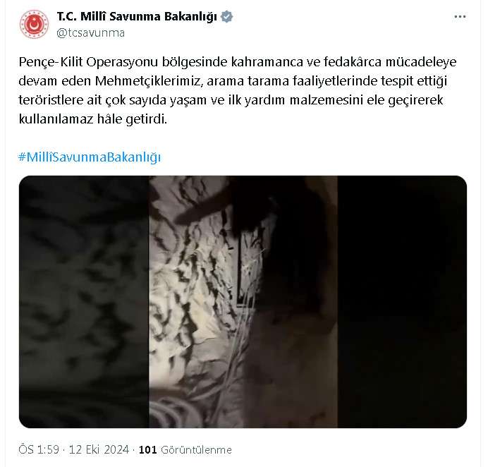 Bakanlığın sosyal medya hesabından yapılan açıklamada, "Pençe-Kilit Operasyonu bölgesinde kahramanca ve fedakarca mücadeleye devam eden Mehmetçiklerimiz, arama tarama faaliyetlerinde tespit ettiği teröristlere ait çok sayıda yaşam ve ilk yardım malzemesini ele geçirerek kullanılamaz hale getirdi" denildi.
