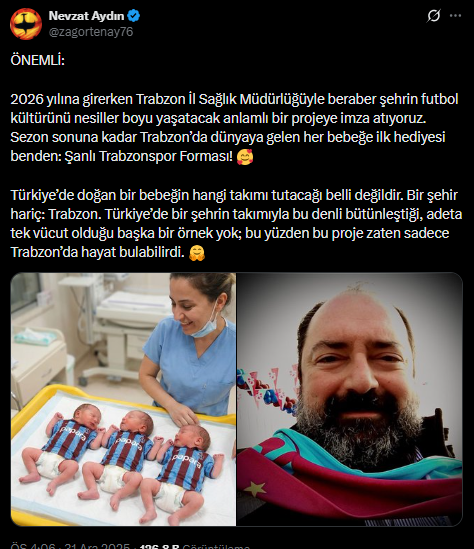 Trabzonspor’un eski yöneticilerinden iş insanı Nevzat Aydın, 2026 yılına girerken şehri heyecanlandıran anlamlı bir projeyi hayata geçirdi. Trabzon İl Sağlık Müdürlüğü ile imzalanan protokol kapsamında, sezon sonuna kadar Trabzon’da dünyaya gelen her bebeğe ilk hediyesi olan Şanlı Trabzonspor Forması, bizzat Nevzat Aydın tarafından hediye edilecek.
