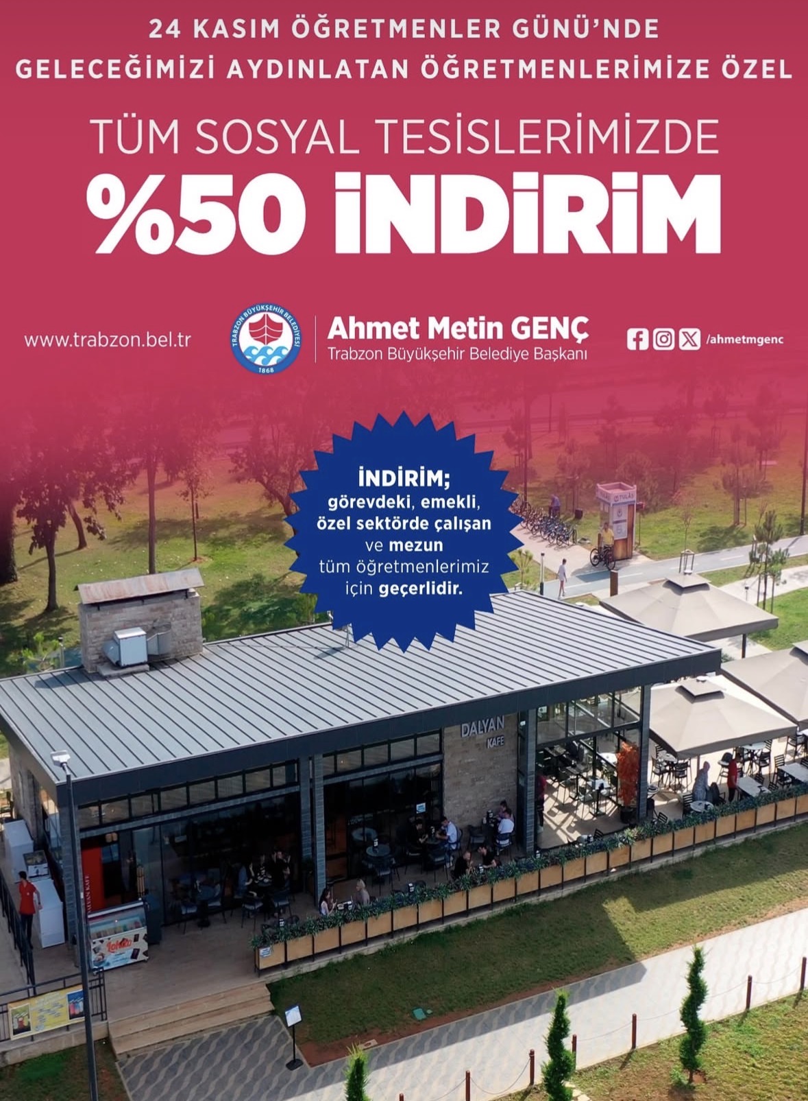 Trabzon Büyükşehir Belediyesi, 24 Kasım Öğretmenler Günü dolayısıyla anlamlı bir uygulamayı hayata geçirdi. Büyükşehir Belediyesi'ne ait tüm sosyal tesislerde, görevde olan, çalışmayan ya da emekli olan ayrımı yapılmaksızın tüm öğretmenlere özel olarak yüzde 50 indirim uygulanacak. Bu jest, öğretmenlere olan minnetin küçük bir göstergesi olarak açıklandı.