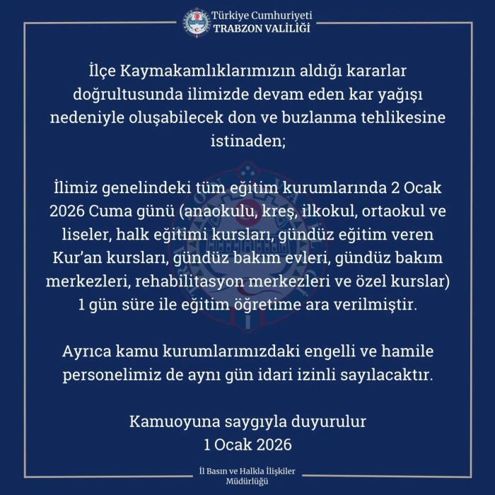 Trabzon Valiliği, il genelinde etkili olan kar yağışı, don ve buzlanma tehlikesi nedeniyle radikal bir karar aldı. Şalpazarı ile başlayan tatil haberi, Valilik açıklamasıyla tüm şehre yayıldı. 2 Ocak 2026 Cuma günü Trabzon’un tamamında eğitim-öğretime ara verildi.
