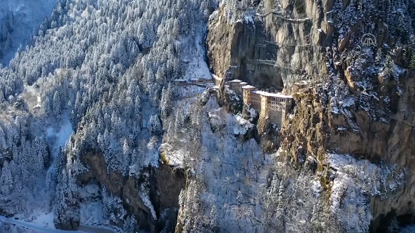 Trabzon'un Maçka ilçesindeki Karadağ'ın Altındere Vadisi'nde 300 metre yükseklikte kayalar oyularak inşa edilen Sümela Manastırı, bugünlerde ziyaretçilerini karlı kaplı doğasıyla karşılıyor.