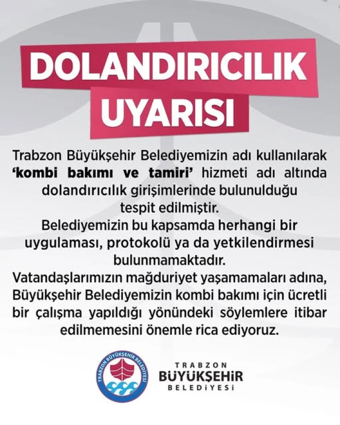 Trabzon Büyükşehir Belediyesi, son günlerde bazı kişilerin belediyenin adını kullanarak “ kombi bakımı ve tamiri” hizmeti adı altında vatandaşları dolandırmaya çalıştığını tespit etti. Konuya ilişkin yapılan açıklamada, belediyenin bu kapsamda herhangi bir uygulaması, protokolü veya yetkilendirmesi bulunmadığı vurgulandı.