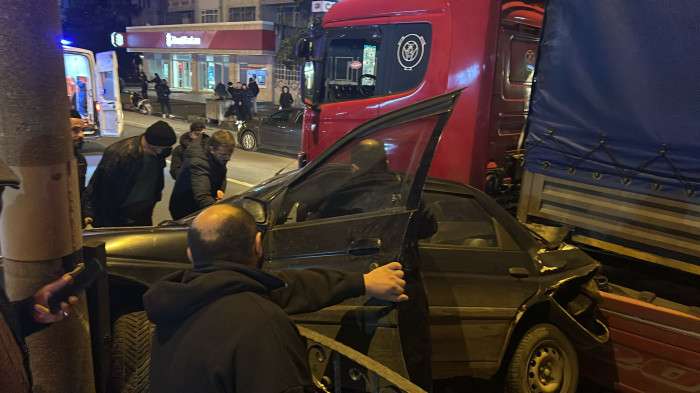 TRABZON'un Akçaabat ilçesinde TIR'ın çarptığı otomobile çarptığı kazada sürücü yaralandı. Otomobilin hurdaya döndüğü kaza, güvenlik kamerasına yansıdı.