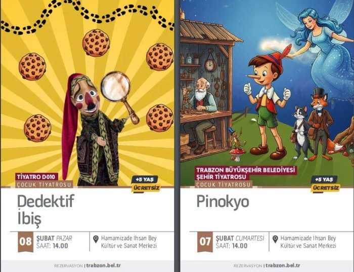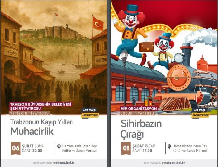 Trabzon Büyükşehir Belediyesi, Şubat boyunca da kültür ve sanat etkinliklerini vatandaşlarla buluşturacak. Büyükşehir Belediyesi Kültür, Sanat ve Sosyal İşler Dairesi Başkanlığı tarafından hazırlanan program dahilinde tiyatro oyunları, konserler, söyleşiler ve sergiler düzenlenecek. Hamamizade İhsan Bey Kültür ve Sanat Merkezi’nde gerçekleştirilecek etkinlikler kapsamında, 6 Şubat Cuma günü saat 20.00’de Trabzon Büyükşehir Belediyesi Şehir Tiyatrosu tarafından “Trabzon’un Kayıp Yılları: Muhacirlik” adlı yetişkin oyunu sahnelenecek. 7 Şubat Cumartesi günü saat 14.00’te “Pinokyo”, 8 Şubat Pazar günü saat 14.00’te ise Tiyatro D010 tarafından “Dedektif İbiş” adlı çocuk oyunu izleyiciyle buluşacak. 13 Şubat Cuma günü saat 20.00’de Akçaabat Belediye Tiyatrosu’nun “Varildeki Adam” adlı yetişkin oyunu sahnelenecek. 14 Şubat Cumartesi günü saat 14.00’te Tiyatro Panki tarafından “Ağustos Böceği ve Karınca”, 15 Şubat Pazar günü saat 14.00’te ise aynı topluluk tarafından “Değirmencinin Dansı” adlı çocuk oyunu sahne alacak.