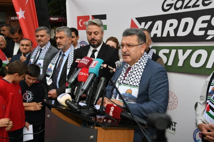 Büyükşehir Belediye Başkanı Ahmet Metin Genç, “Gazze’deki kardeşlerimize el uzatmak ve onların yanında olmak için toplandık. Beraber projeyi icra ettiğimiz Hayrat İnsani Yardım Derneği’mize ve değerli yöneticilerine ayrıca teşekkür ediyorum. Allah razı olsun. İki yıldır barbar İsrail devletinin vahşet ve soykırımına maruz kalan, zulmü altında olan Gazze’deki kardeşlerimiz acı çekiyor. 68 bini aşkın kardeşimiz hayatını kaybetti, 100 bini aşkın kardeşimiz yaralı. Büyük bir yıkım ve felaket var. Günün sonunda insanlık vicdanı ortaya çıktı. Bütün insanlık adına ortaya koyulan irade esas alınarak bir ateşkes süreci başlatıldı. Bu süreçle beraber Sayın Cumhurbaşkanımız Recep Tayyip Erdoğan’ın ortaya koyduğu diplomatik temaslar, çalışmalar ve gayretler ile en sonunda BM zirvesinin sonucunda şu anda ateşkes sağlanmış durumda. Dileğimiz ve duamız kalıcı bir ateşkes süreci olması. Aynı zamanda bağımsız, özgür bir Filistin ve Kudüs" dedi.