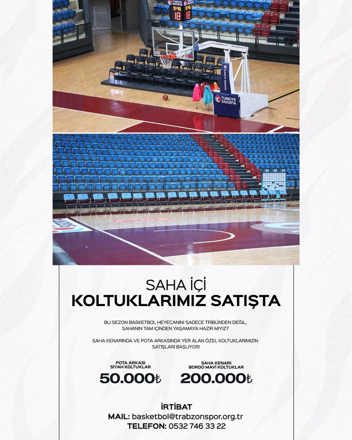 Trabzonspor Basketbol Takımı, bu sezon taraftarlarına unutulmaz bir deneyim sunuyor. Saha kenarında ve pota arkasında yer alan özel koltuklar satışa çıktı!