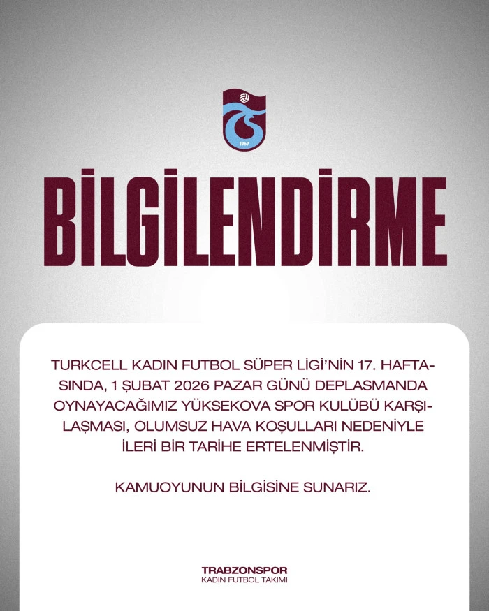 Turkcell Kadın Futbol Süper Ligi’nin 17. haftasında deplasmanda oynanması planlanan Yüksekova Spor Kulübü - Trabzonspor karşılaşması, bölgedeki elverişsiz hava şartları nedeniyle ileri bir tarihe ertelendi.