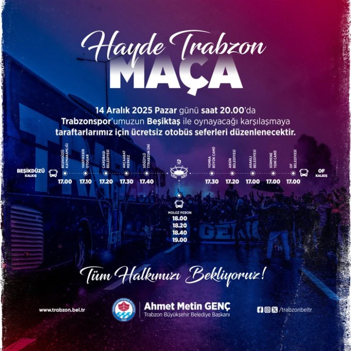Büyükşehir Belediyesi tarafından yapılan paylaşımda, “Trabzonspor’umuzun bu akşam Beşiktaş ile oynayacağı maç için ücretsiz otobüs seferleri düzenliyoruz. Takımımıza başarılar dileriz…” ifadelerine yer verildi.