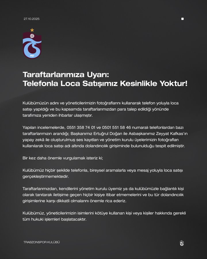 Trabzonspor Kulübü, son dönemde artan dolandırıcılık girişimlerine karşı taraftarlarını korumak amacıyla kritik bir açıklama yaptı. Kulübün adını, yöneticilerinin fotoğraflarını ve hatta seslerini taklit eden kişi veya kişilerin, telefon yoluyla loca satışı bahanesiyle para talep ettiği tespit edildi.