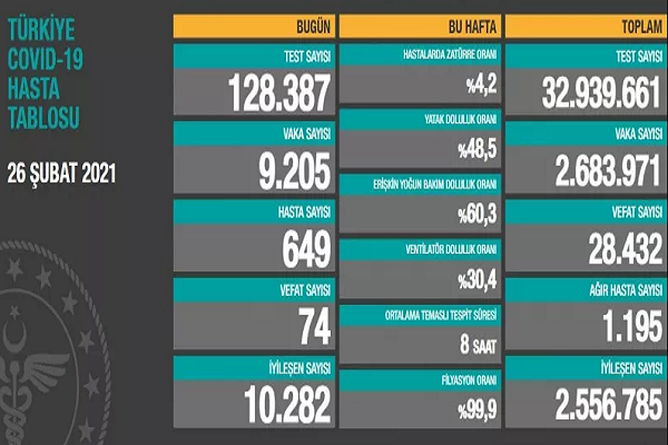 Türkiye'de son 24 saatte 128 bin 387 Covid-19 testi yapıldı, 9 bin 205 kişinin testi pozitif çıktı, 74 kişi hayatını kaybetti.